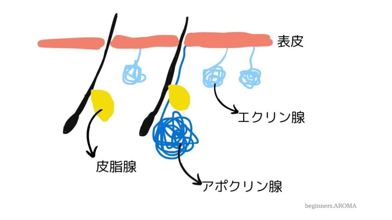 この汗腺は1種類ではなく、『エクリン腺』と『アポクリン腺』の2種類あり、それぞれに汗の性質や仕組みが違います。