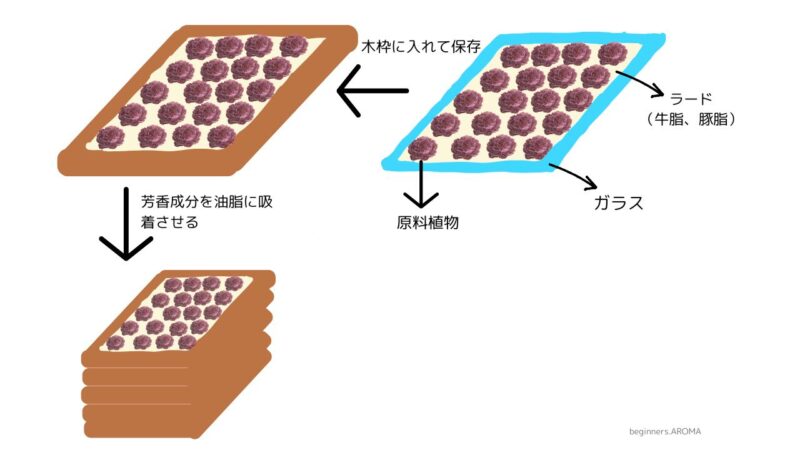 動物性の脂肪に芳香成分を吸着させて行うやり方で、水蒸気蒸留法では植物に含まれている芳香成分が重たすぎて抽出できない植物(バラやジャスミンなど)に使われていました。